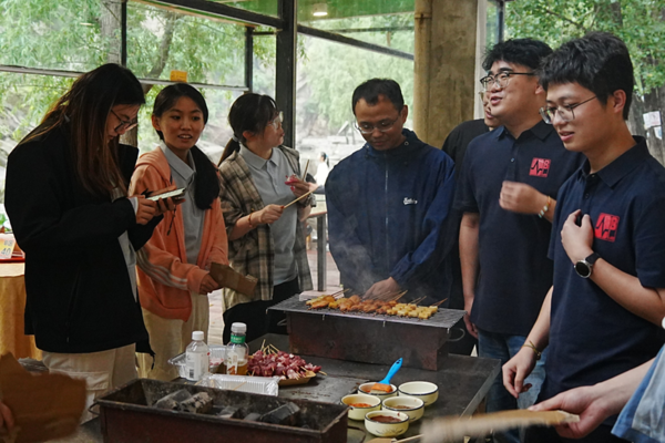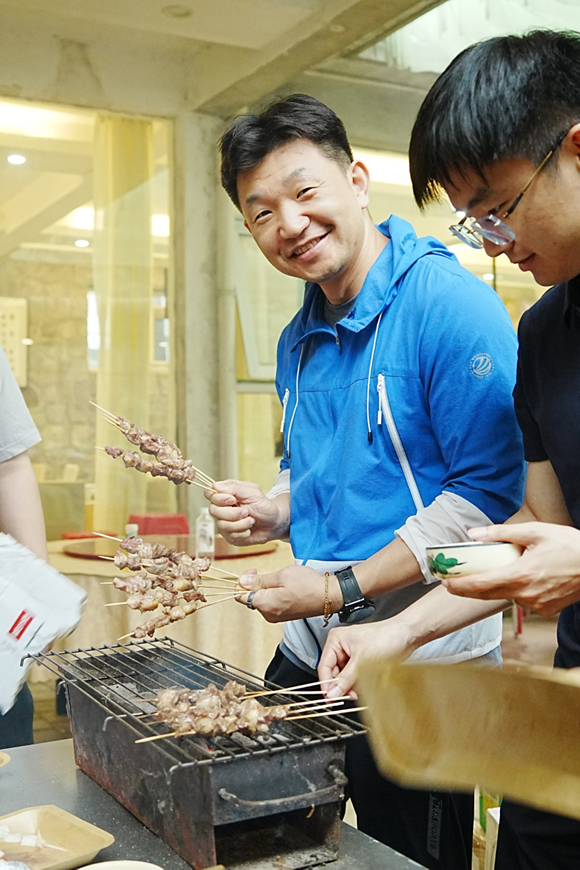 炭火炙烤,共话人间烟火 下午的自由活动之后,17:00开启了备受期待的晚间盛宴。伴随着夕阳余晖,串串与烧烤的香气开始弥漫。 大家围坐在烤炉旁,分工明确:有的负责翻烤肉串,有的负责刷油撒料,有的负责分发美食。滋滋作响的烤肉、冰镇的饮料,加上轻松愉悦的交谈,构成了端午夜最温馨的画面。在这一刻,大家不再是并肩攻克学术难题的同事,更是亲密无间的伙伴。