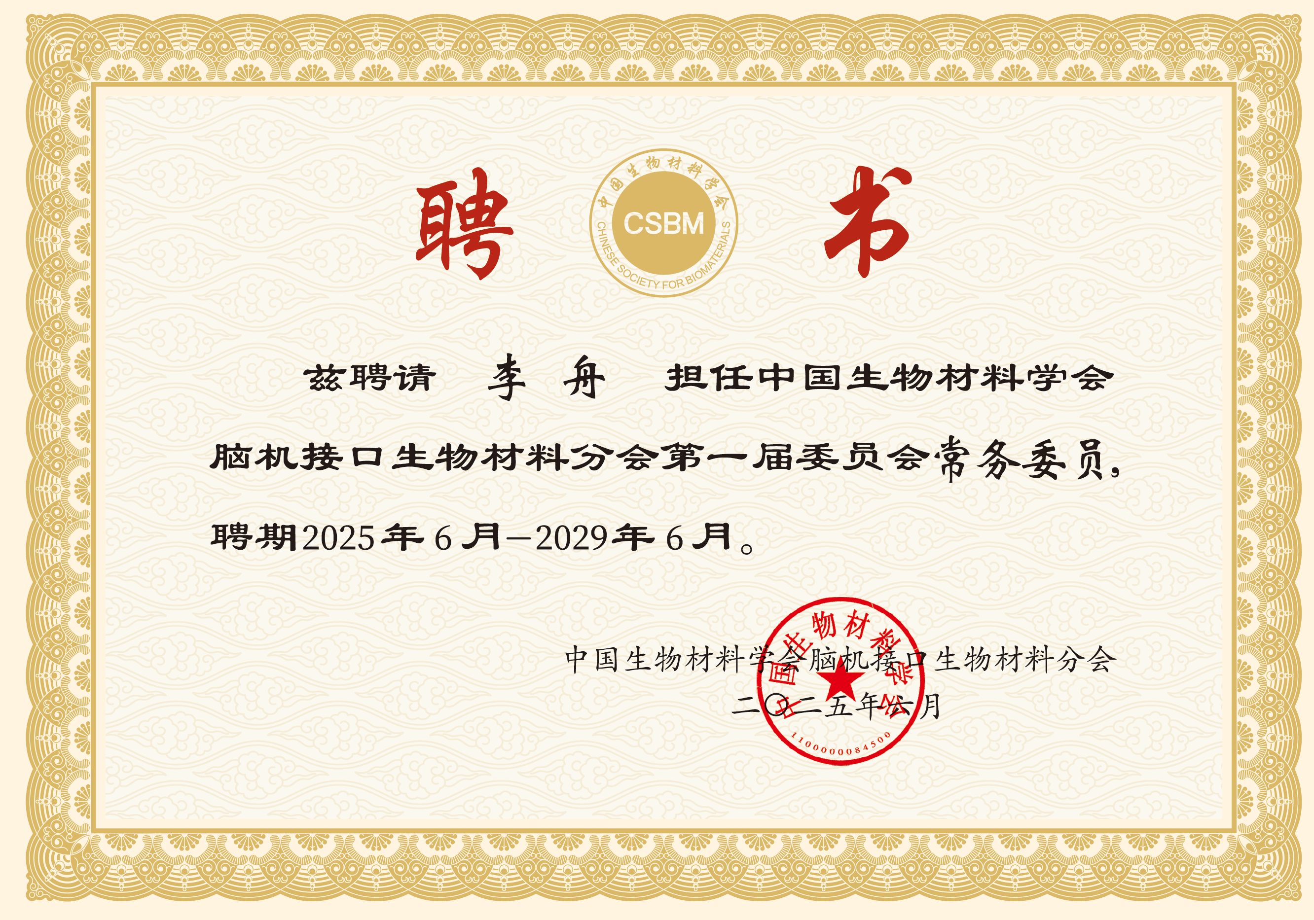 喜报!李舟教授当选中国生物材料学会脑机接口生物材料分会第 一 届委员会常务委员 近日,中国生物材料学会脑机接口生物材料分会正式公布第 一 届委员会聘任名单,李舟教授凭借在生物材料与脑机接口交叉领域的卓 越学术成就与突出行业贡献,成功当选分会第 一 届委员会常务委员,聘期为 2025 年 6 月至 2029 年 6 月。 中国生物材料学会(CSBM)是我国生物材料领域最具权威性与影响力的学术组织之一,始终致力于推动生物材料科学技术的创新发展与产业转化。脑机接口生物材料分会作为学会新兴的重要分支,聚焦脑机接口技术与生物材料的前沿交叉研究,涵盖神经界面材料、生物相容性器件、植入式脑机接口系统等核心方向,旨在搭建高水平学术交流平台,凝聚领域内顶尖科研力量,助力我国脑机接口生物材料技术突破与产业生态构建。 李舟教授长期深耕于生物材料与神经工程交叉领域,在多方向取得了一系列标志性成果,先后在国际**学术期刊发表多篇高水平论文,承担多项国 家级重点科研项目,在国内外脑机接口与生物材料领域享有广泛学术声誉与行业认可度。 此次当选常务委员,既是对李舟教授个人学术能力与科研贡献的高度认可,也彰显了其在脑机接口生物材料领域的学科实力与学术地位。未来,李舟教授将依托分会平台,积极参与领域内学术规划、科研协作与人才培养工作,进一步推动我国脑机接口生物材料领域的创新发展与国际交流,为我国生命健康与智能科技产业的融合升级贡献重要力量。